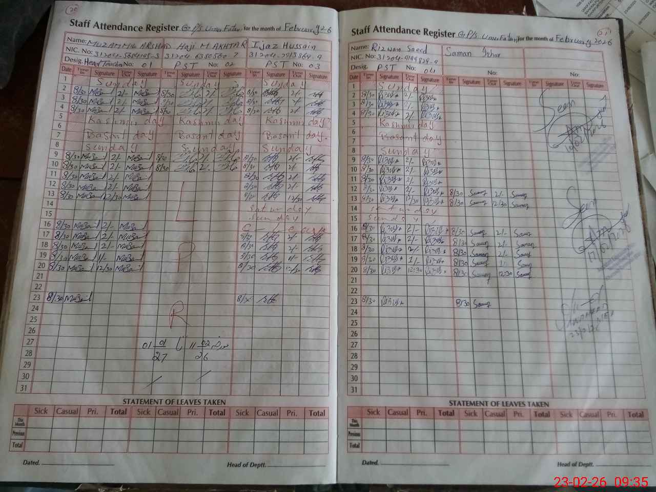 | CNIC | Full Name | Designation | R/C | Absence During Last Calender Month |