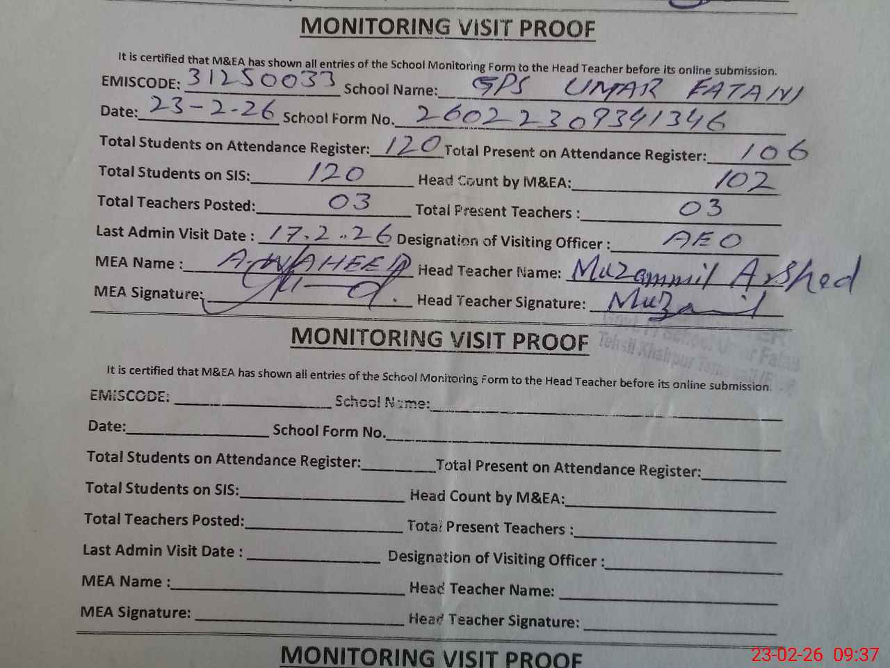 | Attendance Register | Head Teacher | MEA with School | Visit Proof |