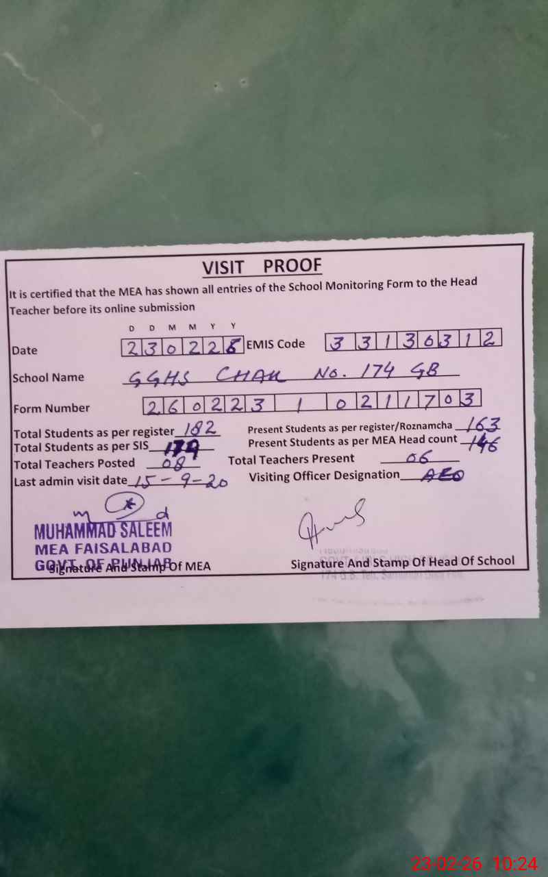 | EMIS Code: 33130312 | Name of School: GGHS CHAK NO 174 GB II SOUTH | |||