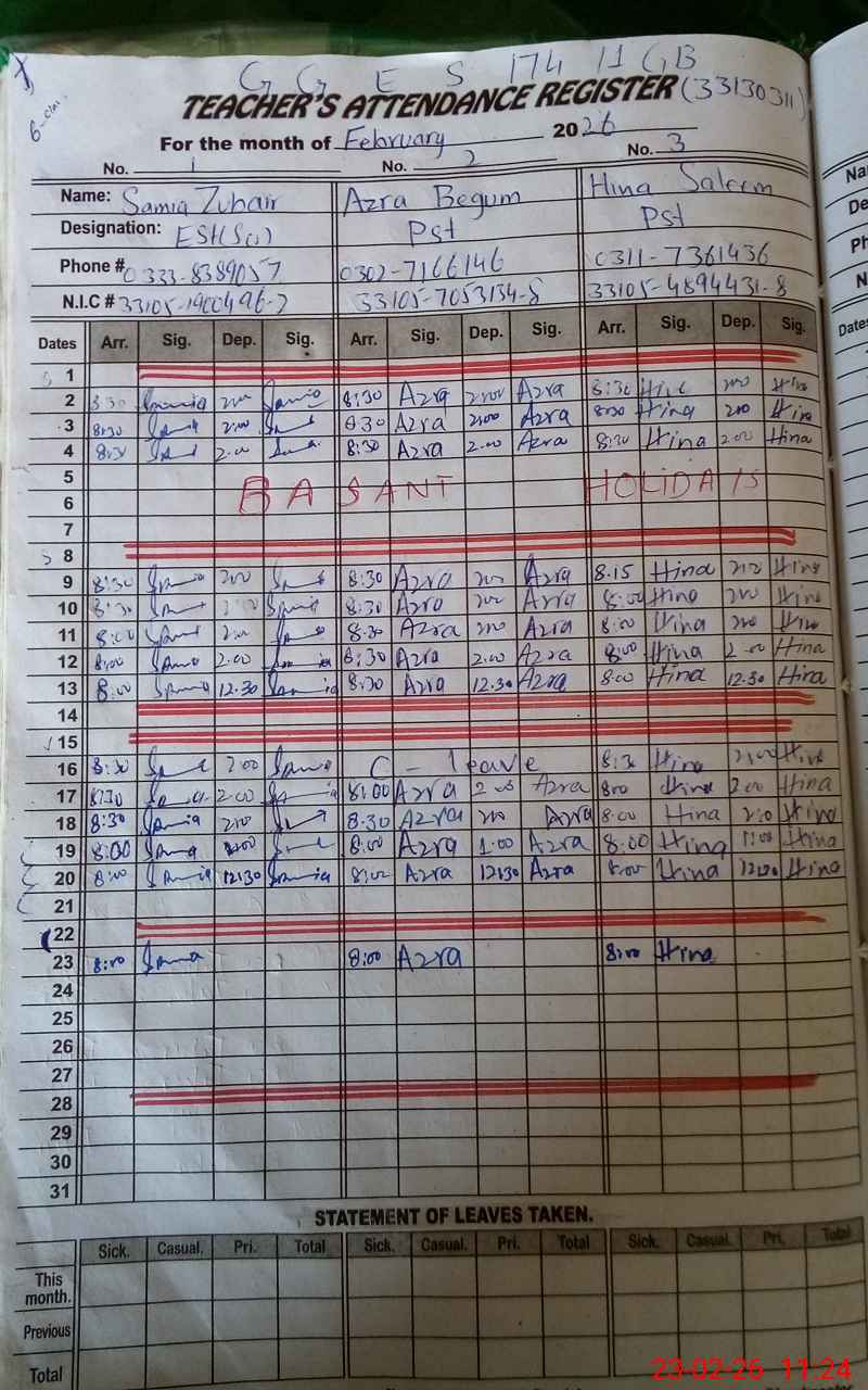 | CNIC | Full Name | Designation | R/C | Absence During Last Calender Month |