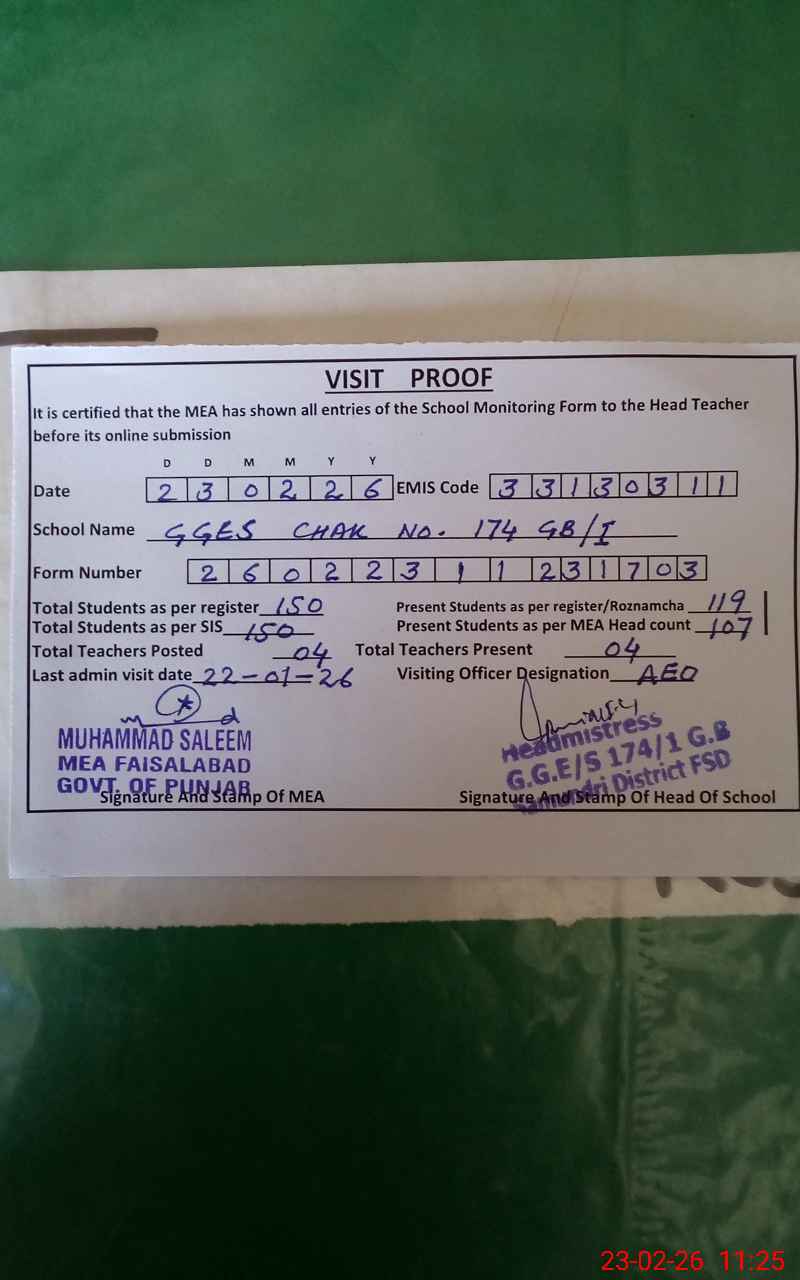 | EMIS Code: 33130311 | Name of School: GGES CHAK NO. 174 GB I | |||