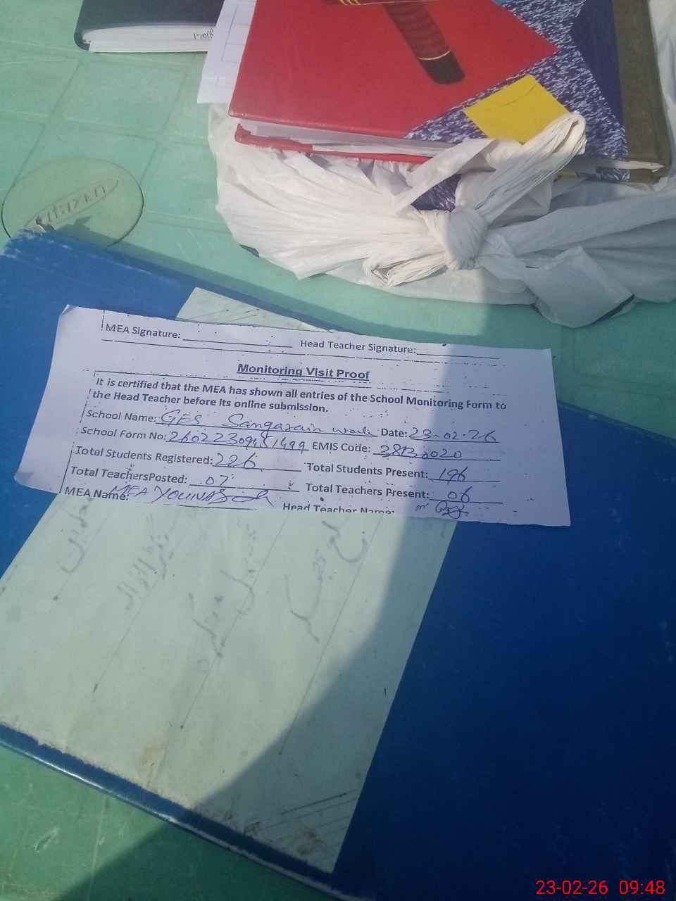 | Attendance Register | Head Teacher | MEA with School | Visit Proof |