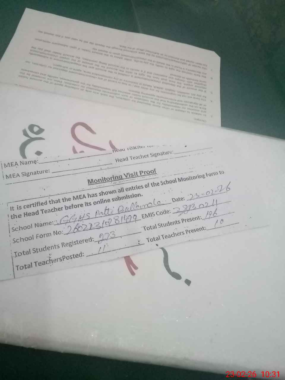 | Attendance Register | Head Teacher | MEA with School | Visit Proof |
