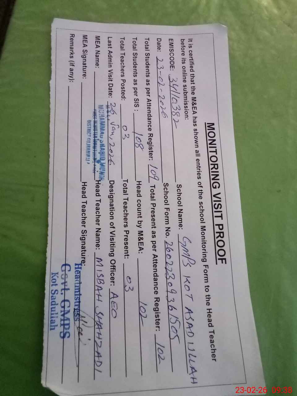 | EMIS Code: 34110382 | Name of School: GMPS KOT ASAD ULLAH | |||