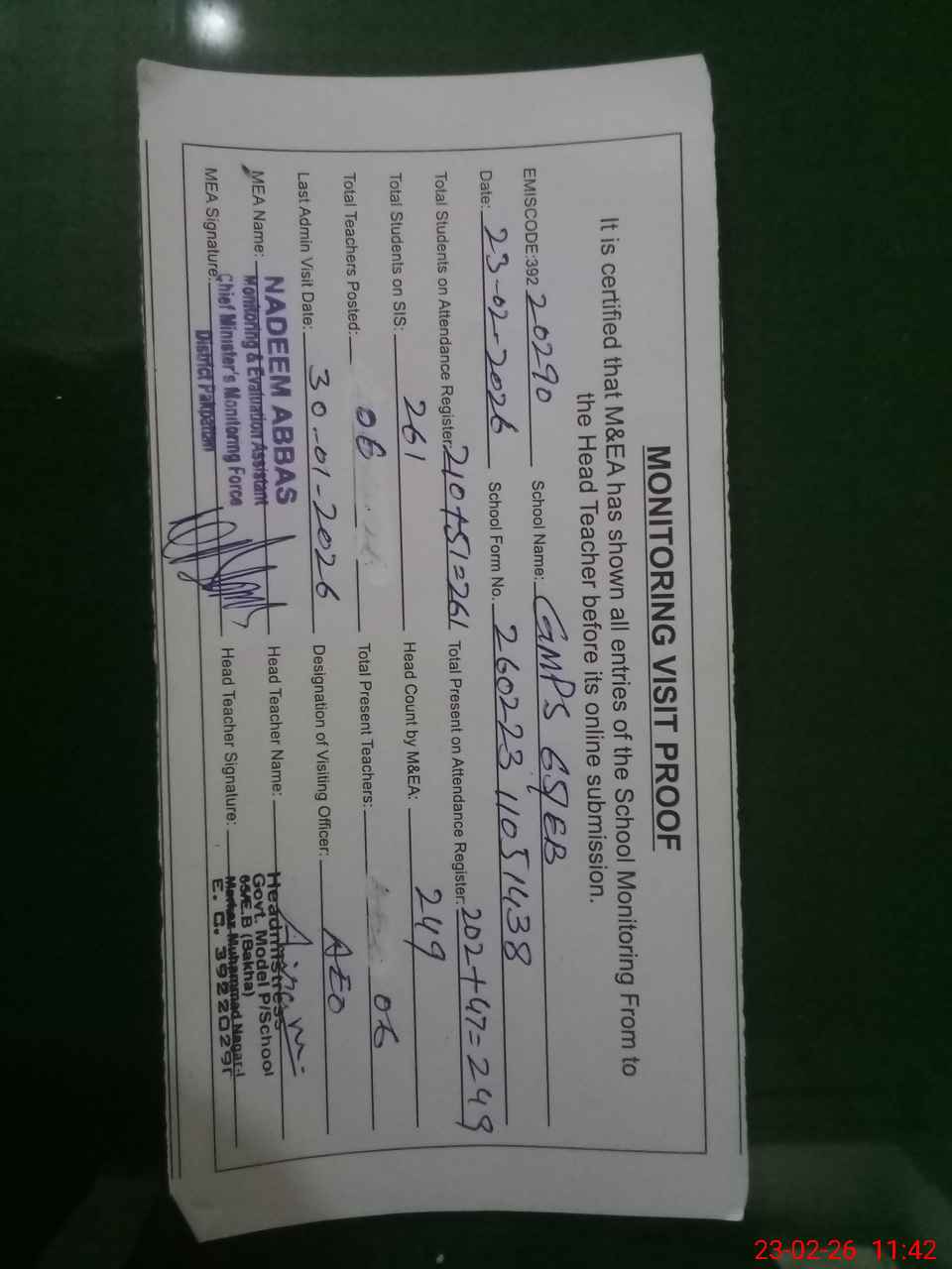 | Certified that this School was Inspected by the Undersigned MEA/DMO Today and the Information Stated Above is as Per Record. | |||||