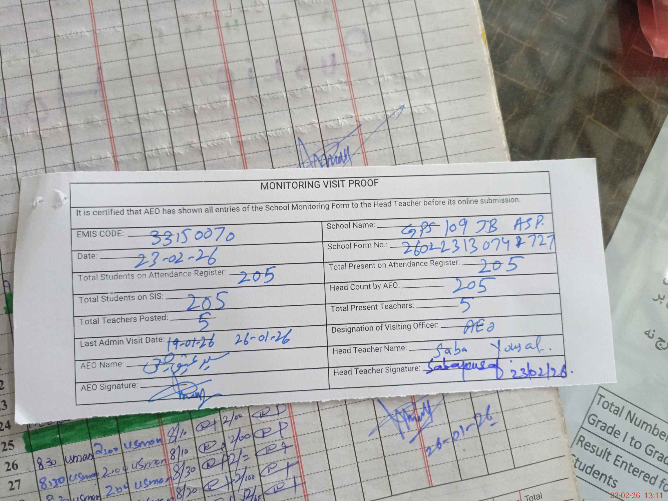 | Attendance Register | Head Teacher | MEA with School | Visit Proof |