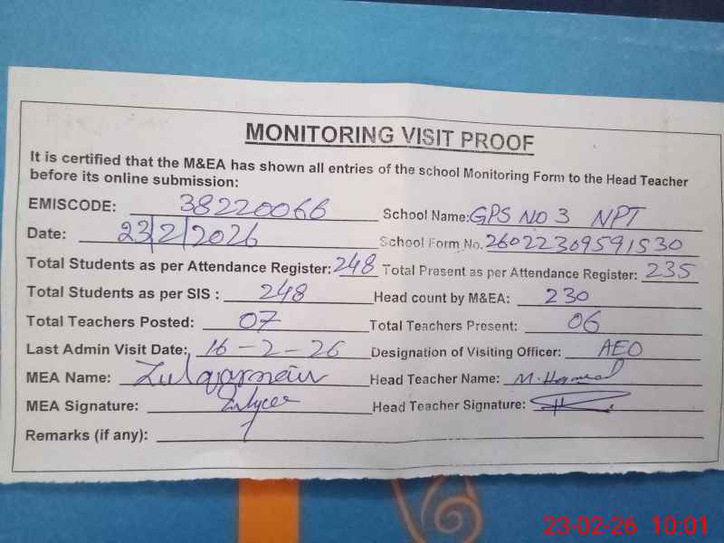 | EMIS Code: 38220066 | Name of School: GPS NO. 3 NOOR PUR THAL | |||