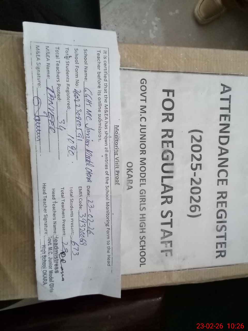 | Attendance Register | Head Teacher | MEA with School | Visit Proof |