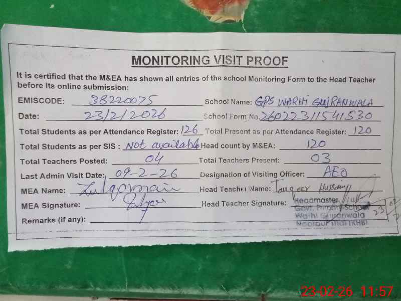| EMIS Code: 38220075 | Name of School: GPS WARHI GUJRAN WALA | |||