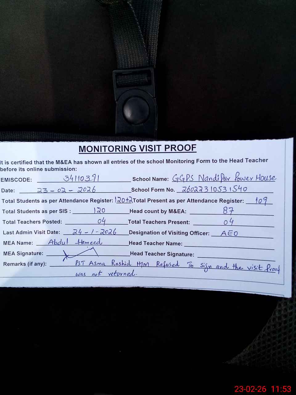 | Attendance Register | Head Teacher | MEA with School | Visit Proof |