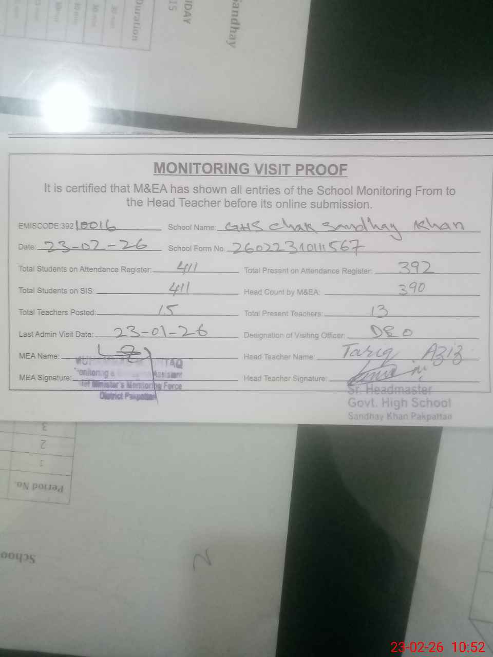 | Attendance Register | Head Teacher | MEA with School | Visit Proof |