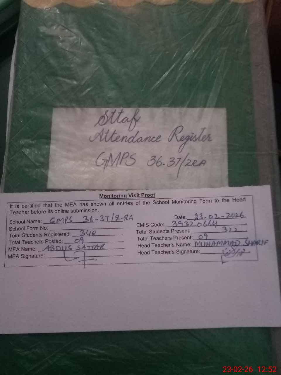 | Attendance Register | Head Teacher | MEA with School | Visit Proof |