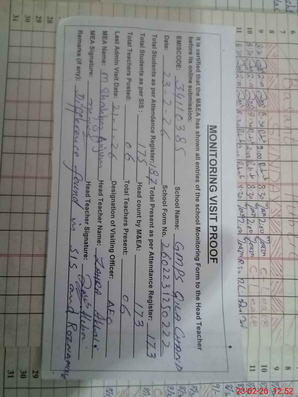 | EMIS Code: 34110385 | Name of School: GMPS QILA CHAND | |||
