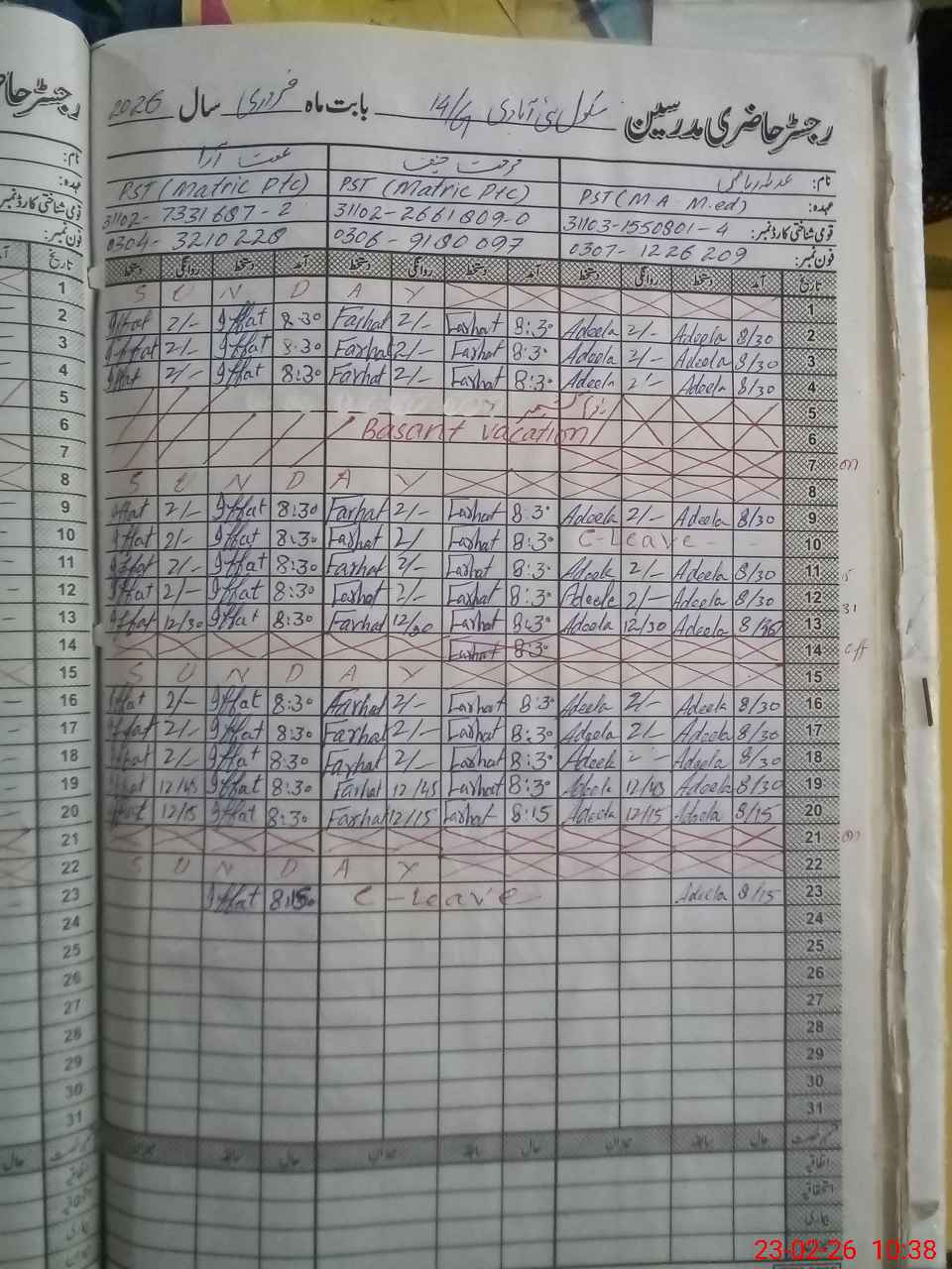 | 31**** | Fa**** Ha**** | PST Arts | Regular | 2 | 0 | 0 | 0 | 0 | 0 | 0 | 0 | 2 | Casual |