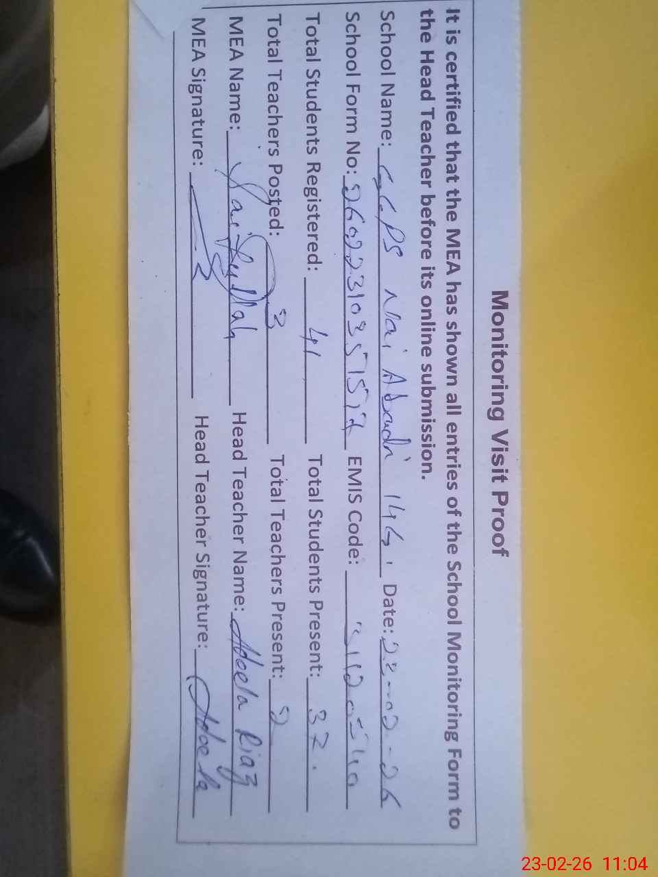 | Attendance Register | Head Teacher | MEA with School | Visit Proof |