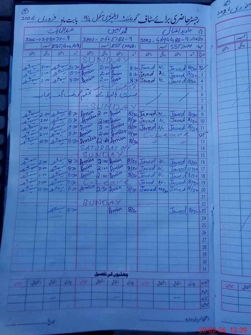 | CNIC | Full Name | Designation | R/C | Absence During Last Calender Month |