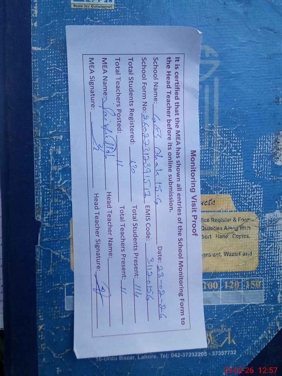 | Attendance Register | Head Teacher | MEA with School | Visit Proof |