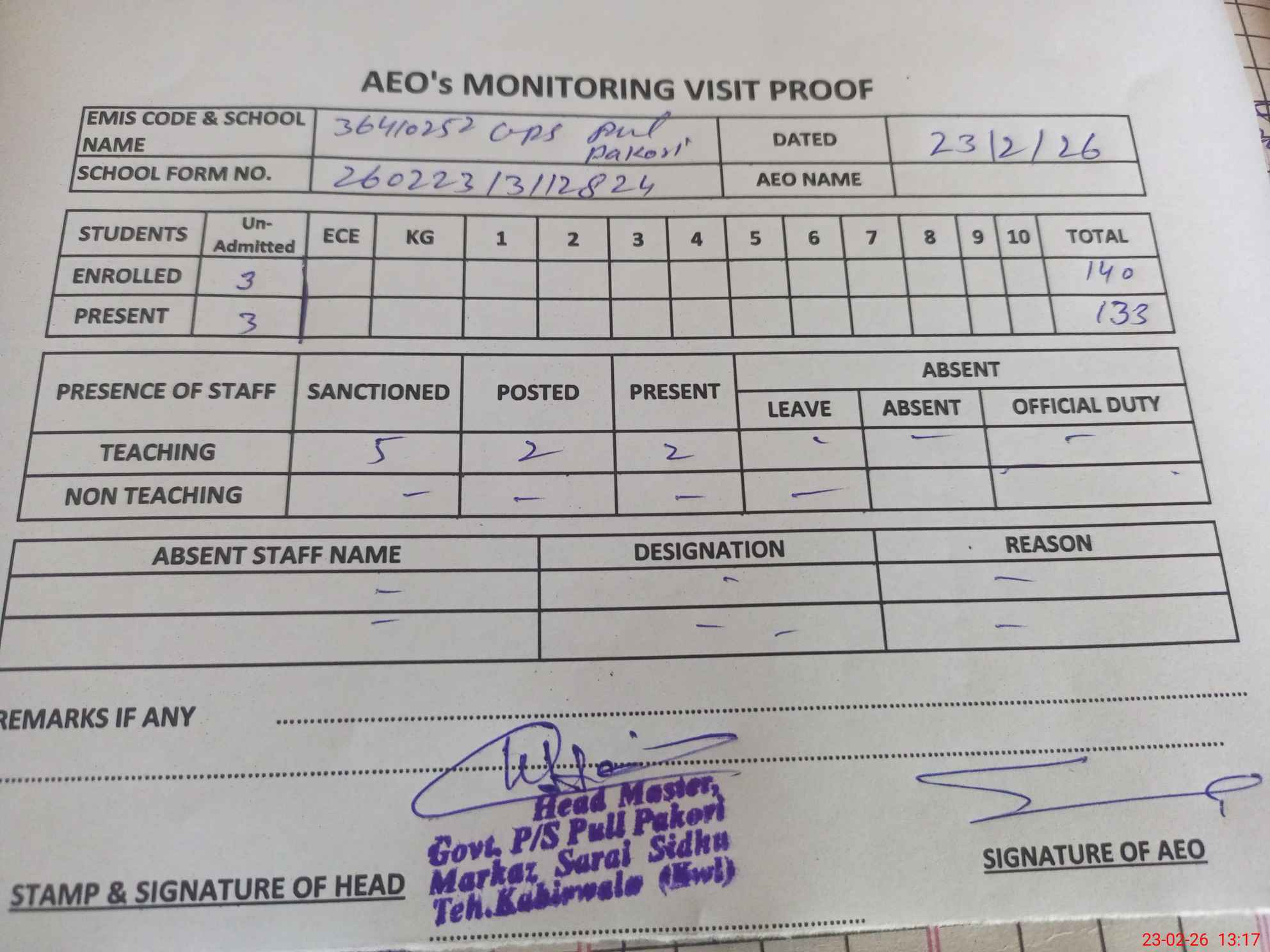 | EMIS Code: 36410252 | Name of School: GPS PUL PAKORI, MOUZA BARAG SARGANA, SARAI SIDHU | |||