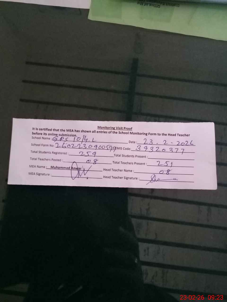 | Attendance Register | Head Teacher | MEA with School | Visit Proof |