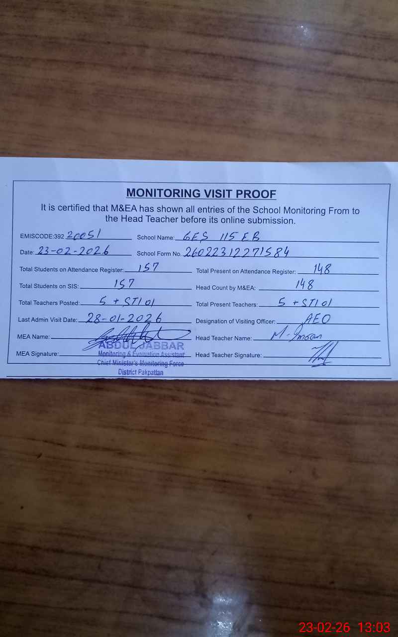 | EMIS Code: 39220051 | Name of School: GES 115 EB ARIF WALA | |||
