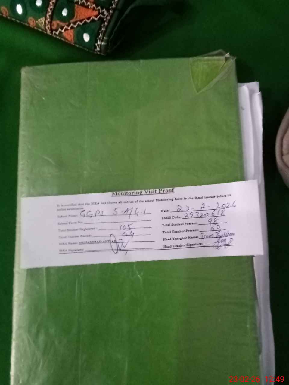 | Attendance Register | Head Teacher | MEA with School | Visit Proof |