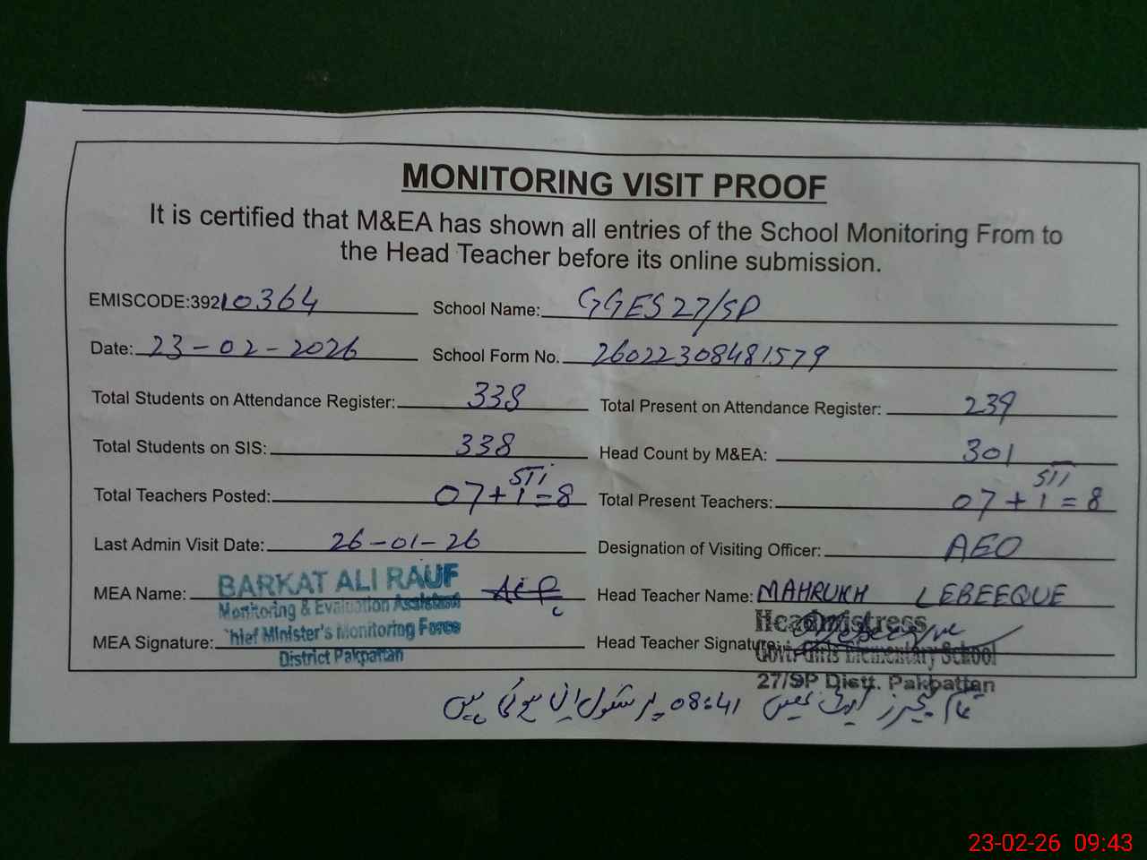 | EMIS Code: 39210364 | Name of School: GGES 27 SP | |||