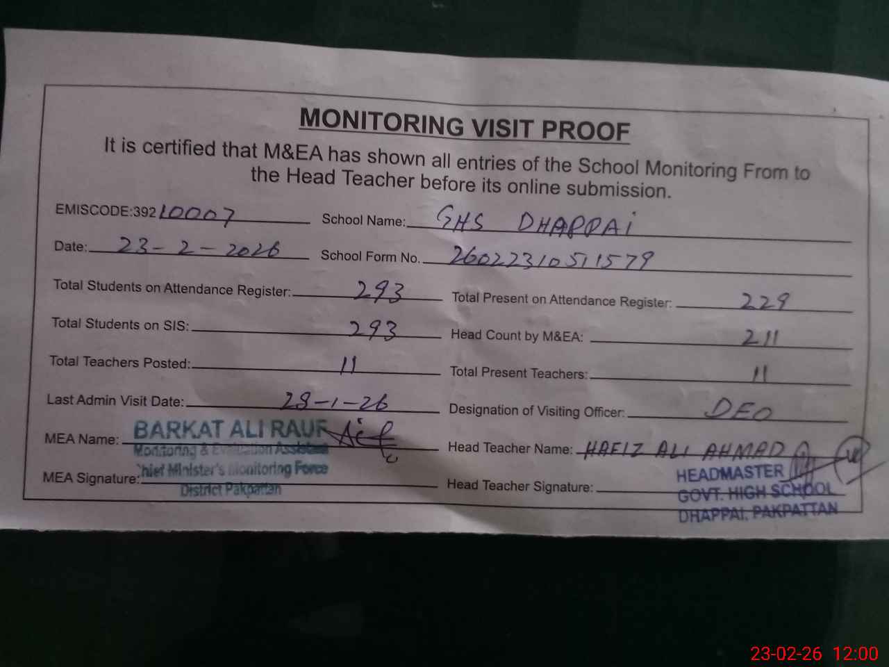 | Attendance Register | Head Teacher | MEA with School | Visit Proof |