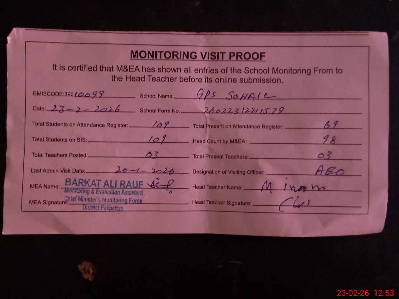| Attendance Register | Head Teacher | MEA with School | Visit Proof |