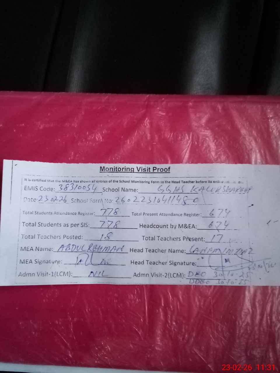 | EMIS Code: 38310054 | Name of School: GGHS KALUR SHAREEF | |||