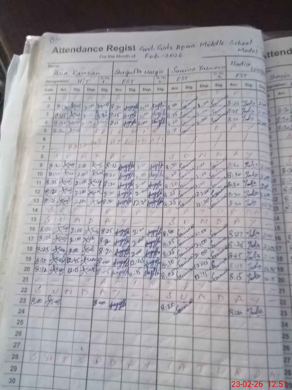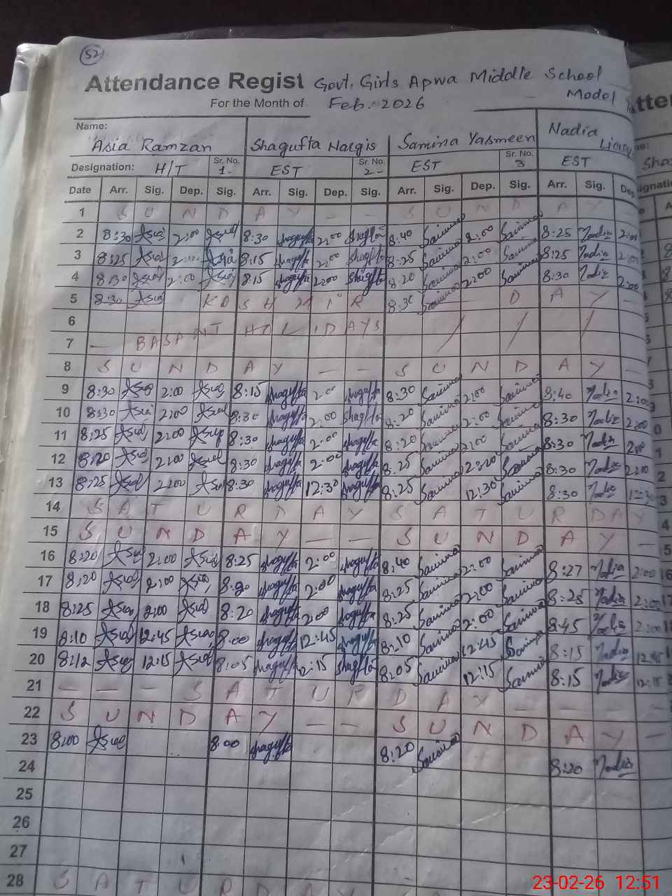| 35**** | Sa**** Ar**** | PST Arts | Regular | 0 | 0 | 31 | 0 | 0 | 0 | 0 | 0 | 0 | Absent (Un-Authorized) |