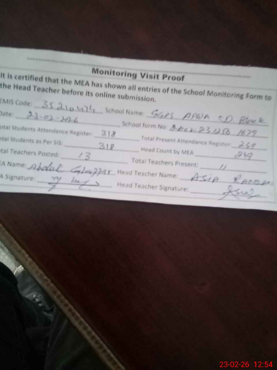 | Attendance Register | Head Teacher | MEA with School | Visit Proof |