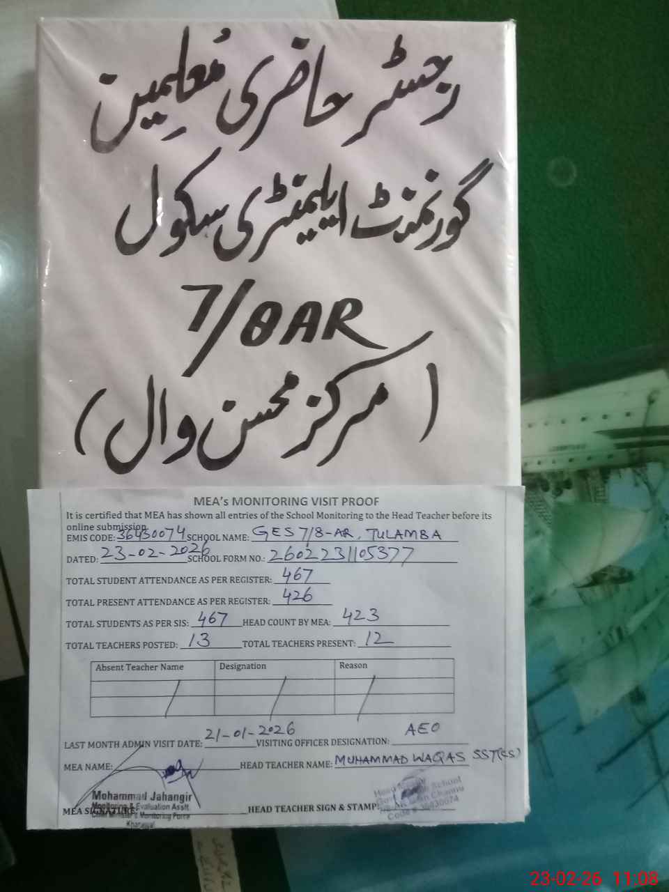 | Attendance Register | Head Teacher | MEA with School | Visit Proof |