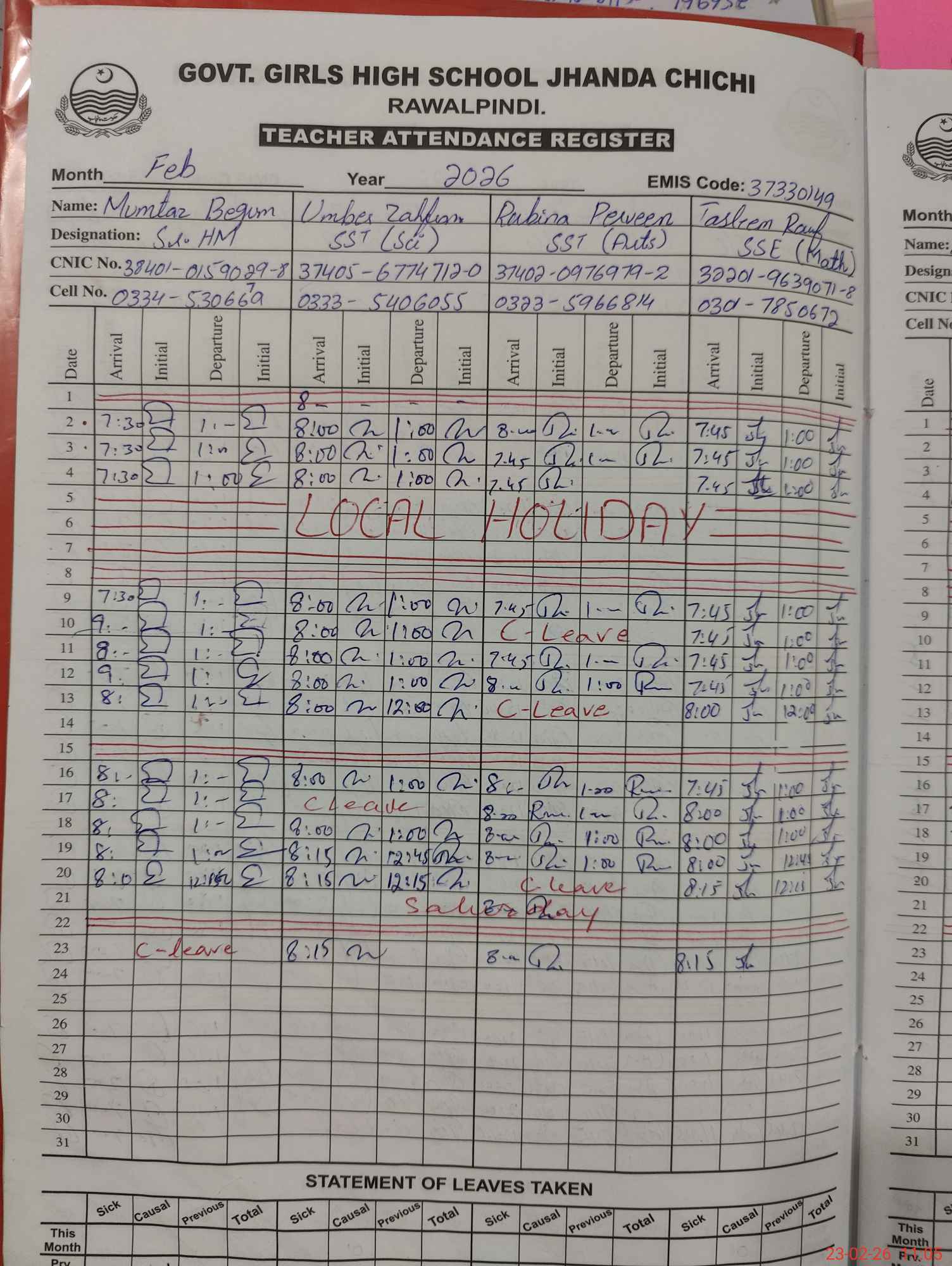 | EMIS Code: 37330149 | Name of School: GGHS JHANDA CHICHI | |||