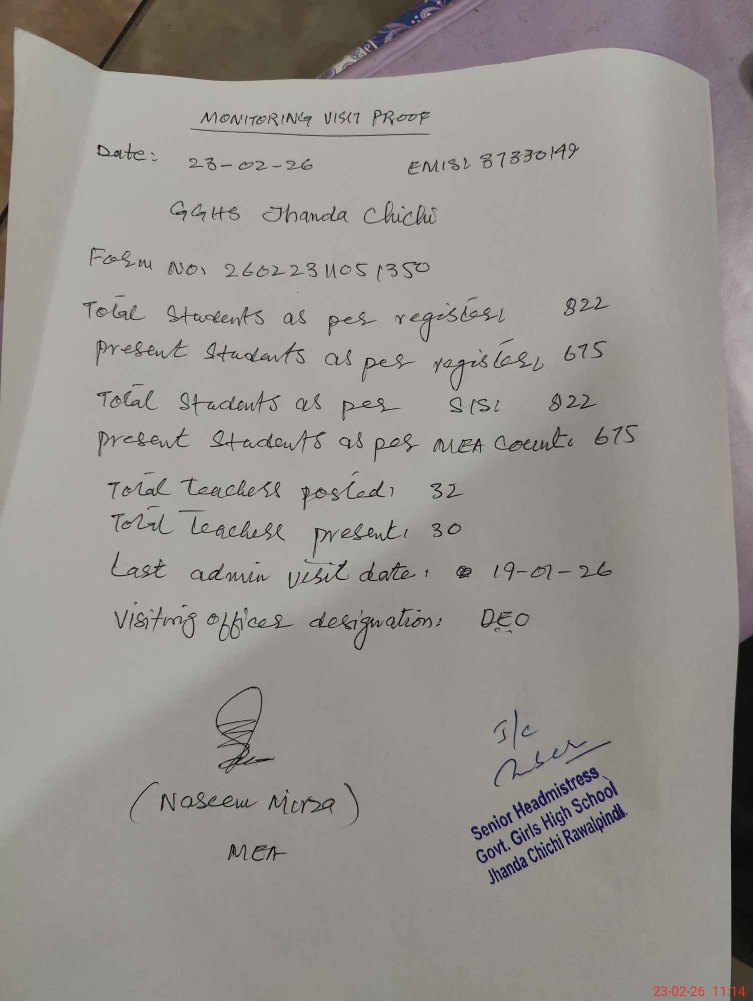 | Certified that this School was Inspected by the Undersigned MEA/DMO Today and the Information Stated Above is as Per Record. | |||||