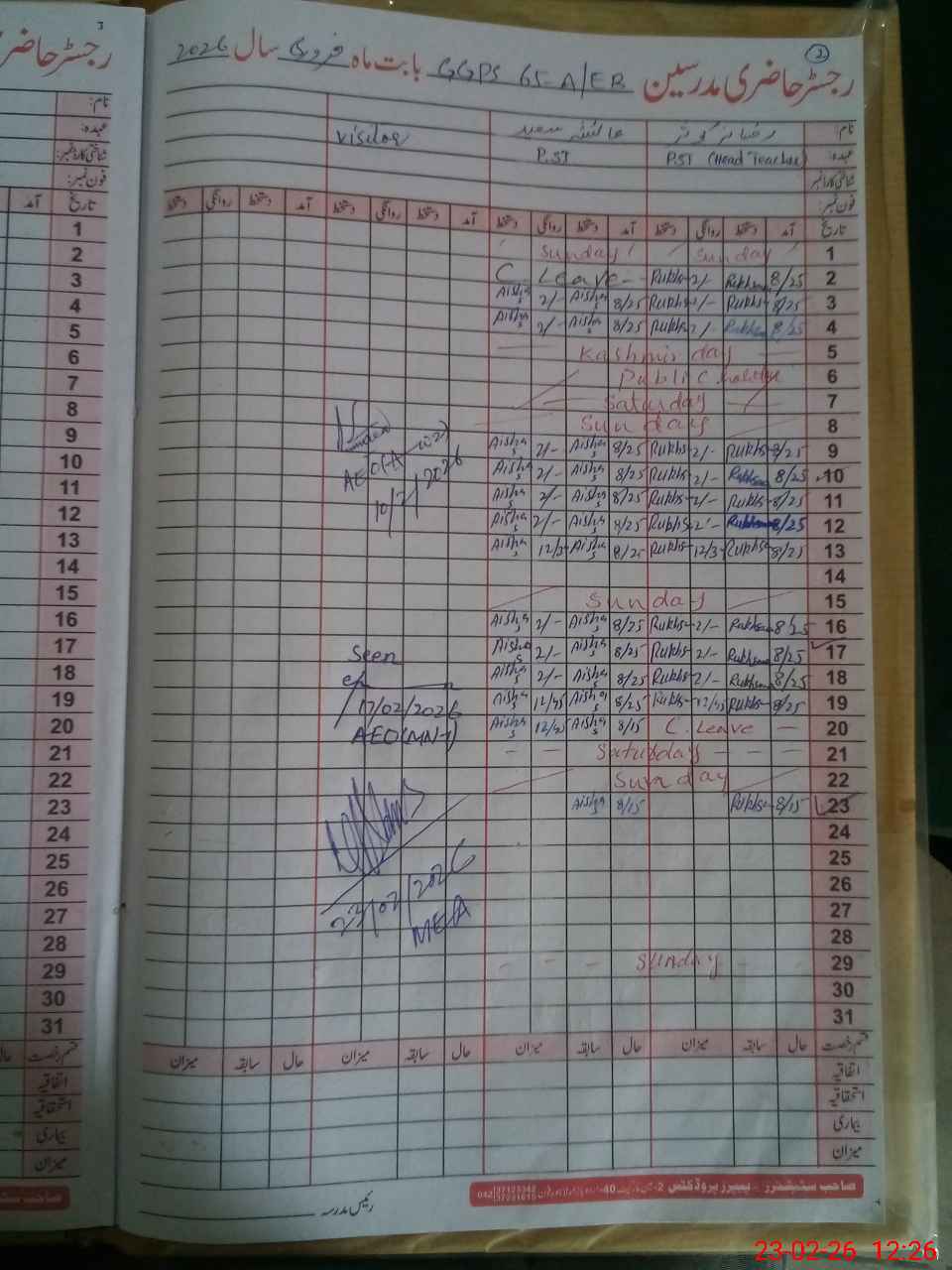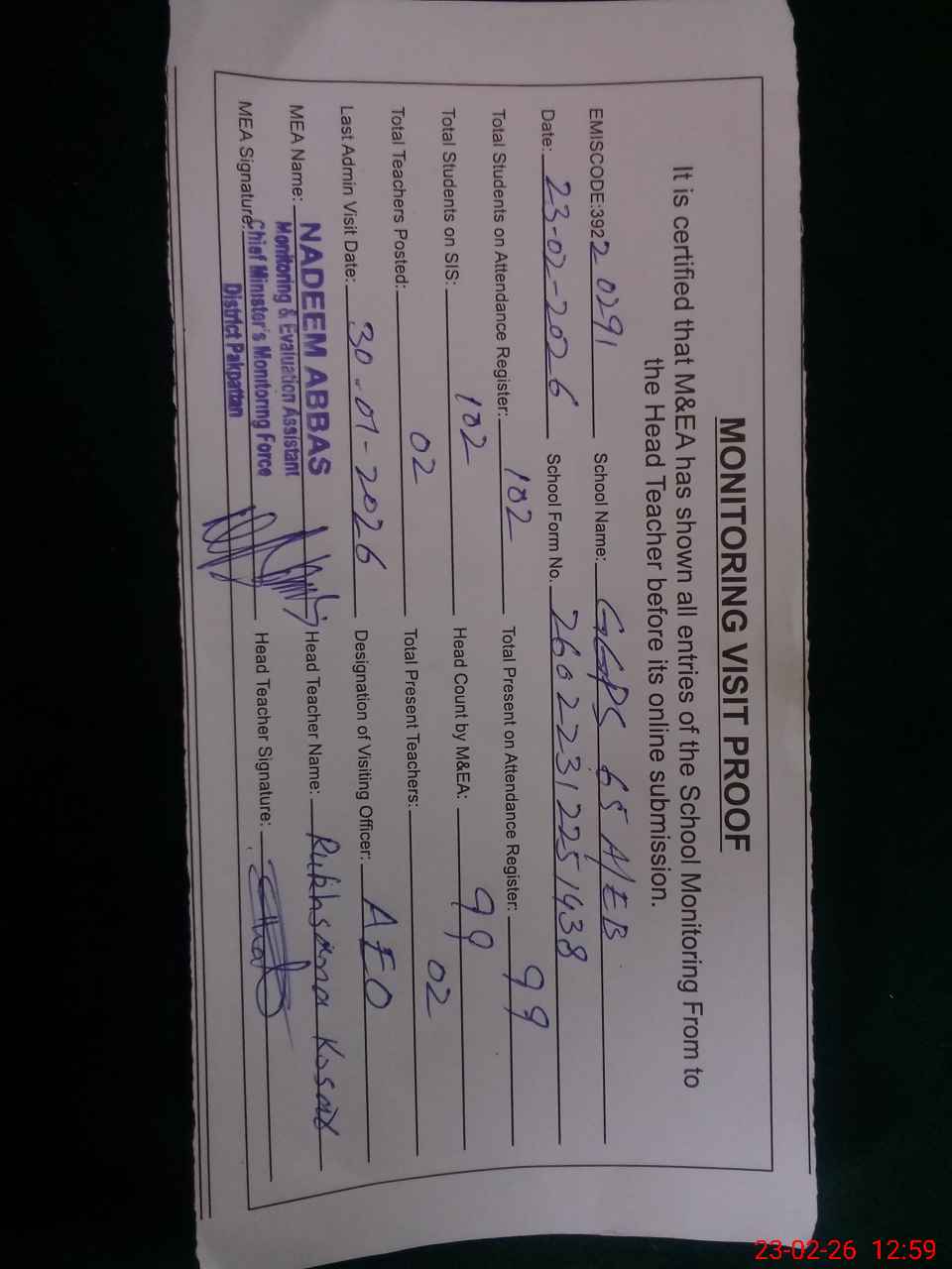 | Attendance Register | Head Teacher | MEA with School | Visit Proof |