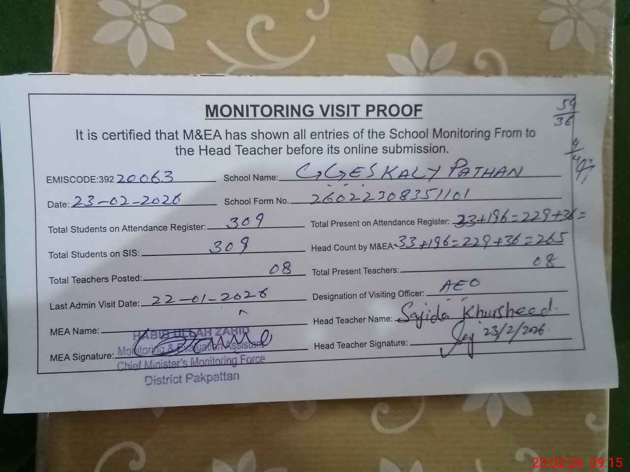 | EMIS Code: 39220063 | Name of School: GGES KALAY PATHAN | |||