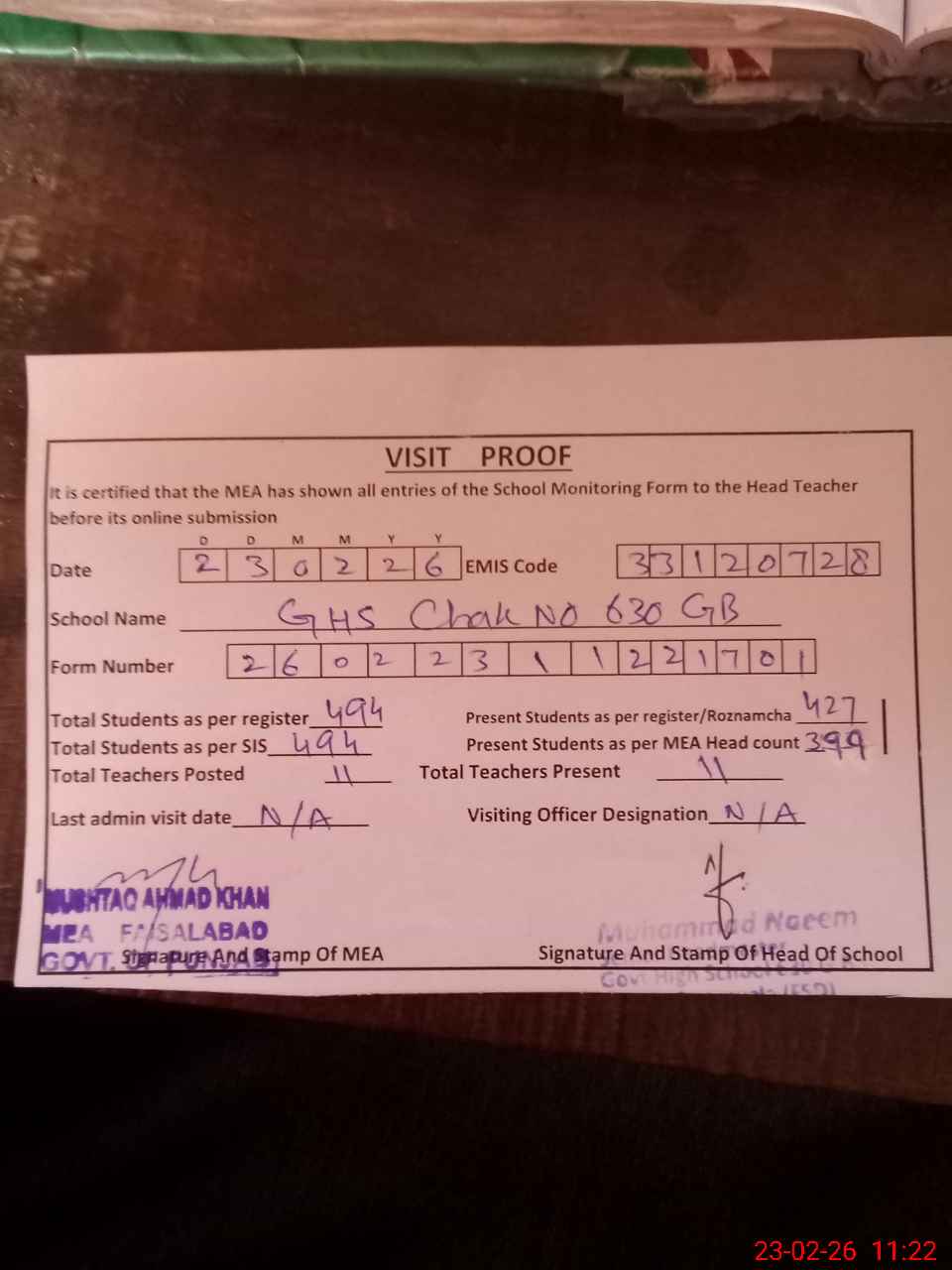 | Attendance Register | Head Teacher | MEA with School | Visit Proof |