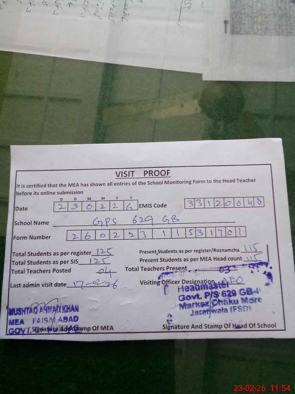 | EMIS Code: 33120040 | Name of School: GPS CHAK 629 GB | |||