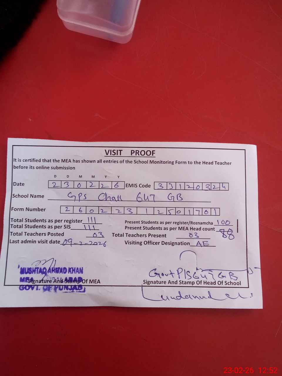 | Attendance Register | Head Teacher | MEA with School | Visit Proof |