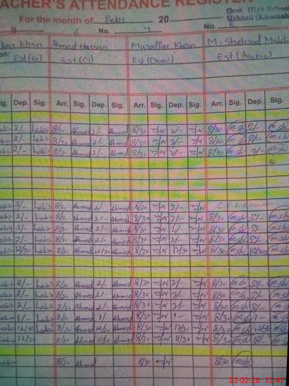 | Remarks (Use Separate Page if Required): ghs uchali student on sis 253 student on register 253 head count 224 last visit DEO 21/1/26 10 teachers are present one teacher Junaid absent from ist dec2025 till now play ground needed security guard | |||||
