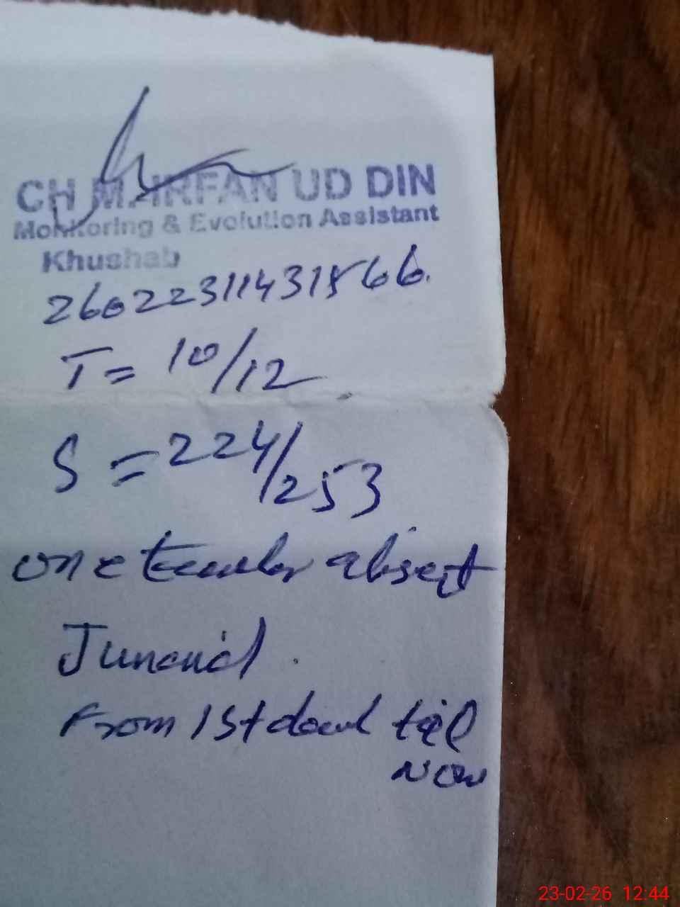 | Name: Am**** Hu**** Designation: (School Headmaster's/Headmistress's) HEADMASTER Phone/Cell Number: 03**** |