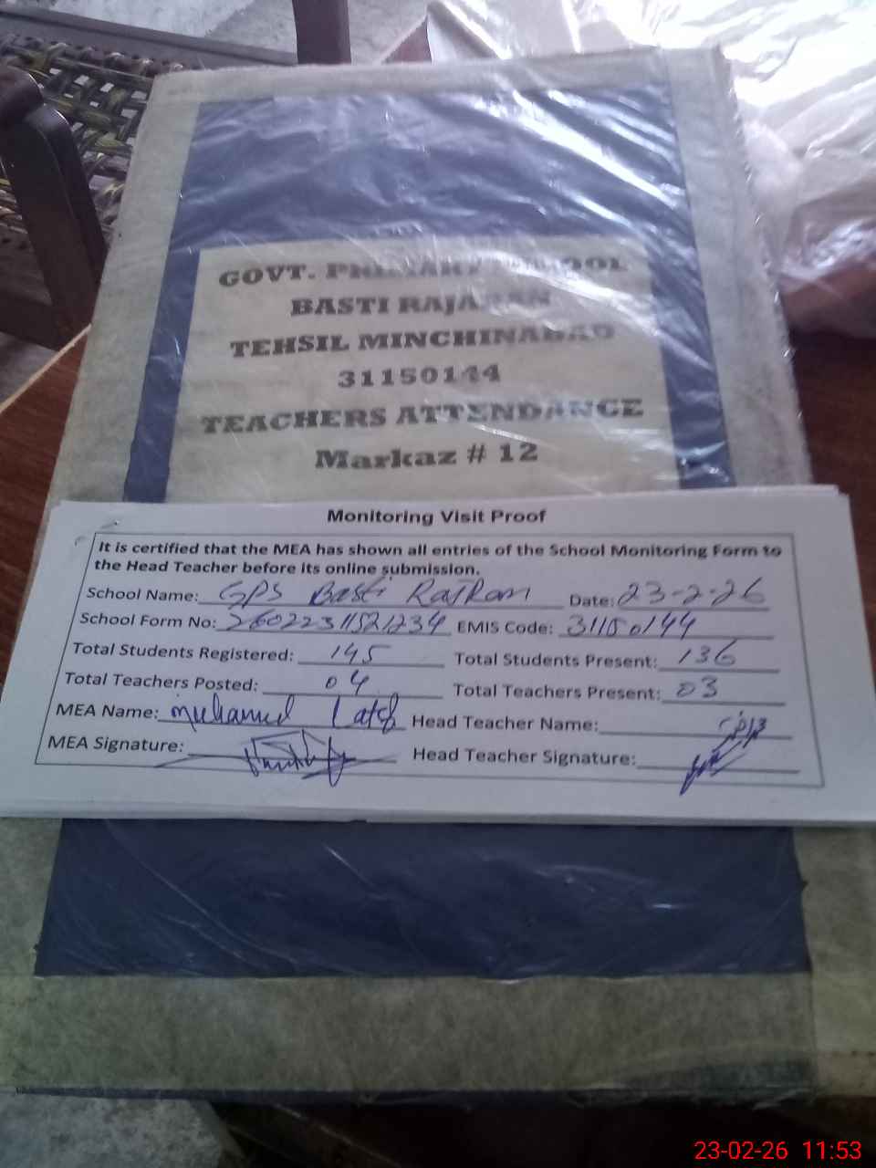 | Attendance Register | Head Teacher | MEA with School | Visit Proof |