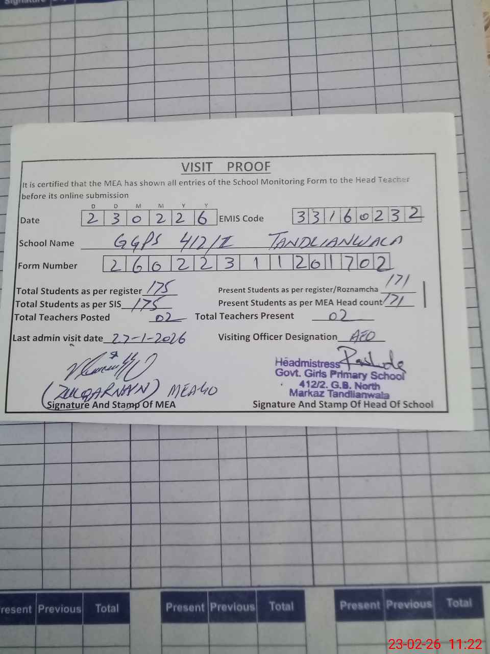 | EMIS Code: 33160232 | Name of School: GGPS CHAK 412 GB II NORTH TANDLIANWALA | |||