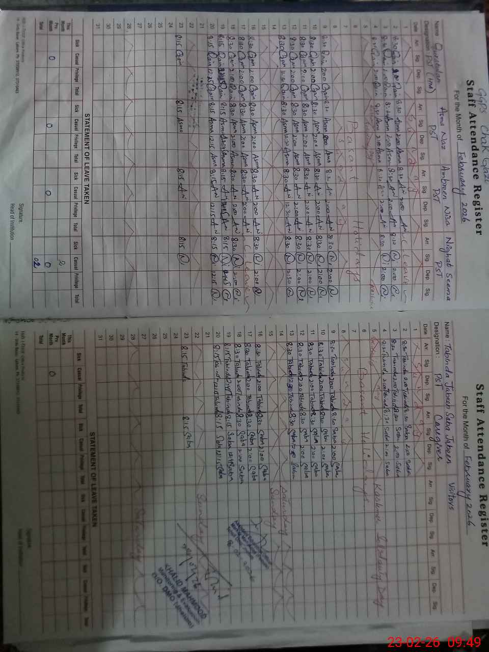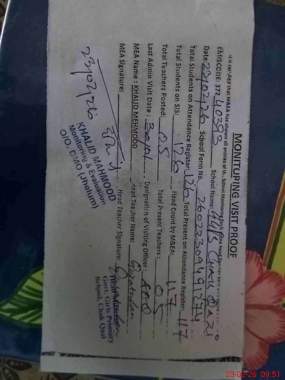 | Attendance Register | Head Teacher | MEA with School | Visit Proof |