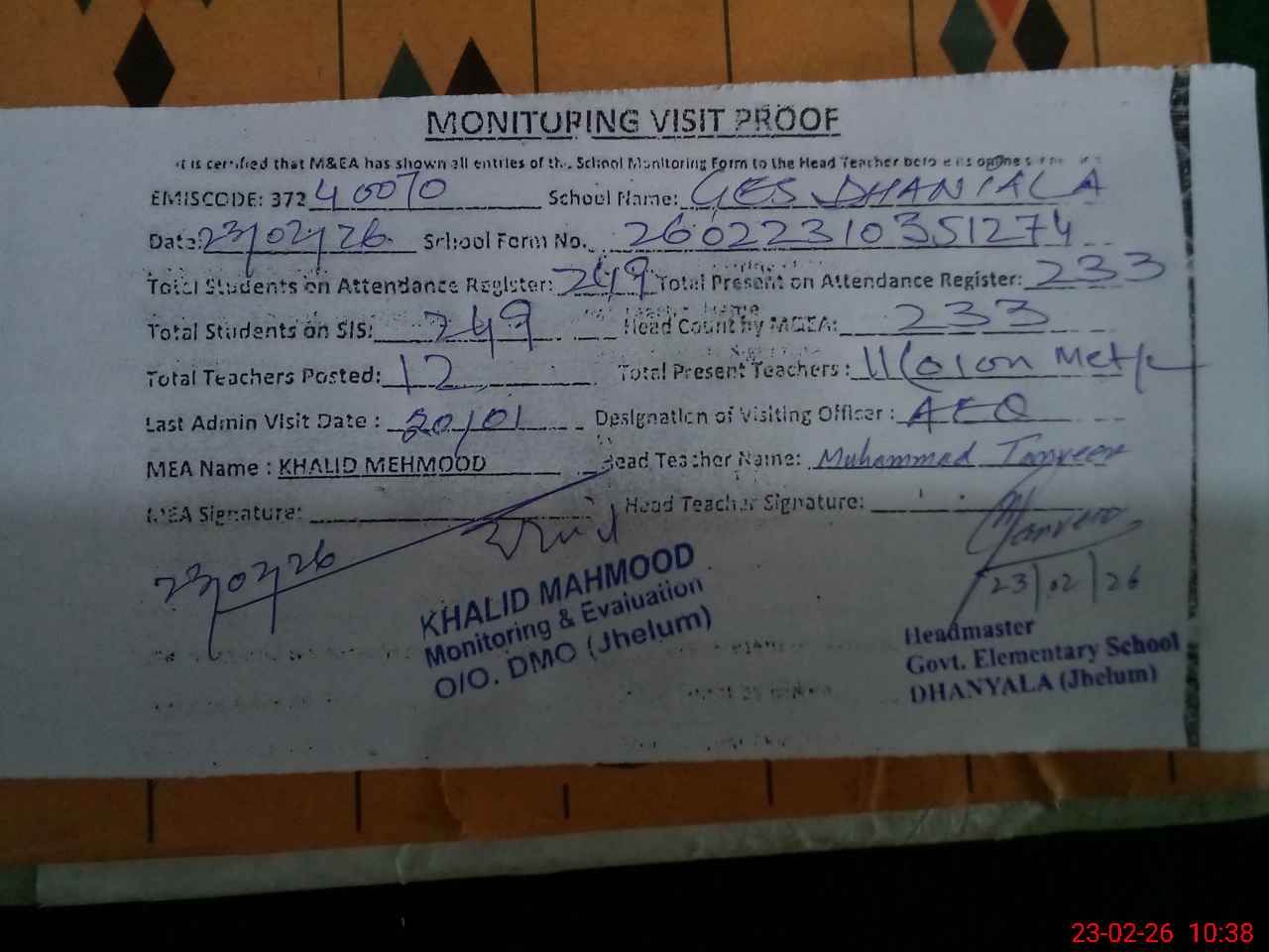 | Certified that this School was Inspected by the Undersigned MEA/DMO Today and the Information Stated Above is as Per Record. | |||||