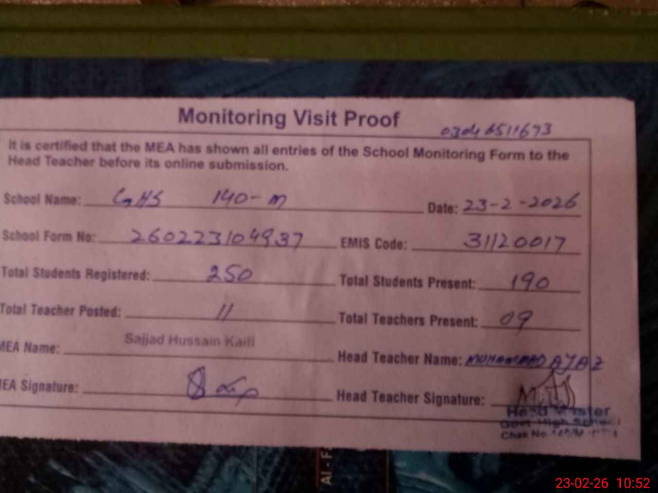 | EMIS Code: 31120017 | Name of School: GHS CHAK NO. 140 MURAD | |||