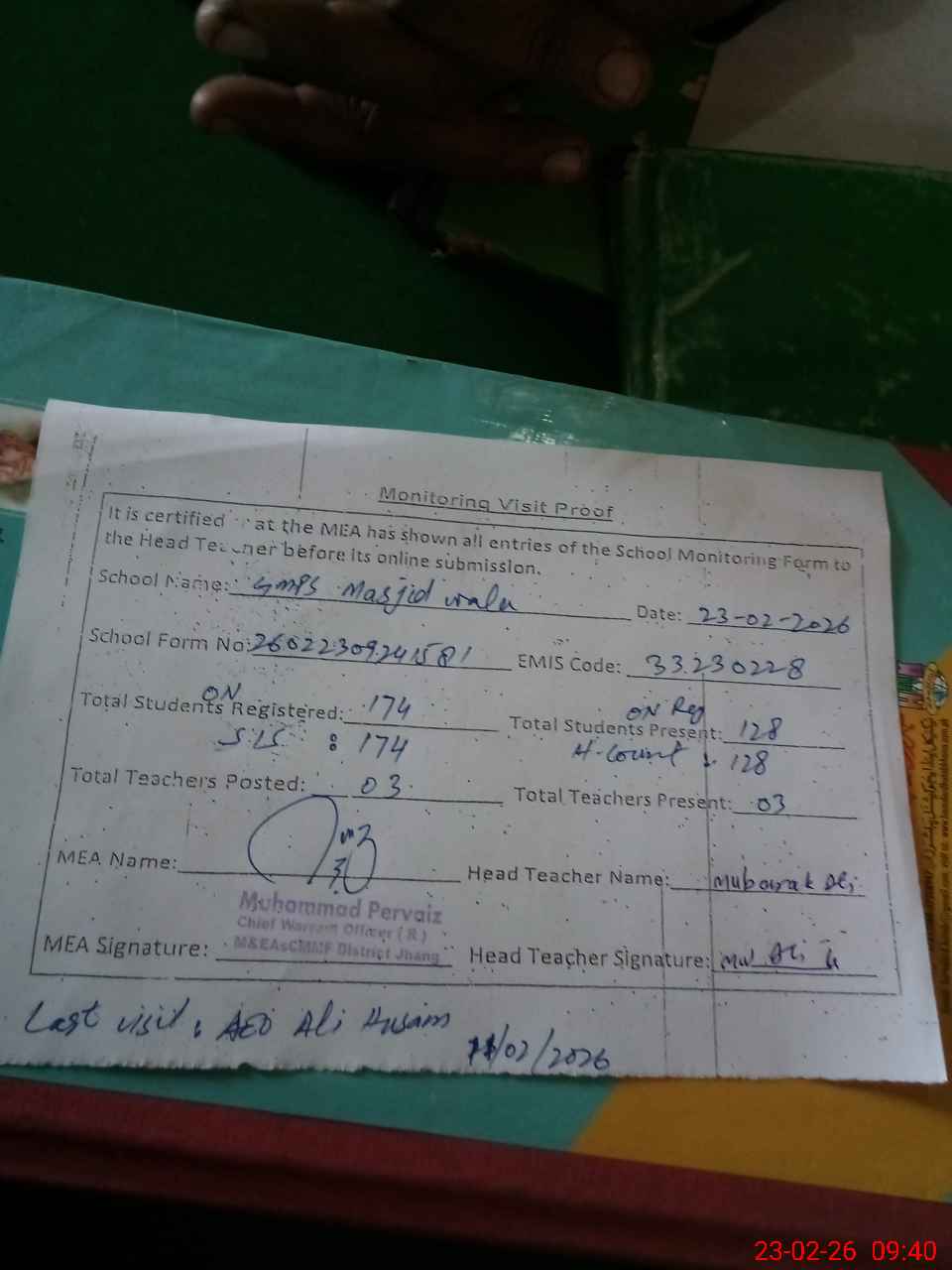 | Attendance Register | Head Teacher | MEA with School | Visit Proof |