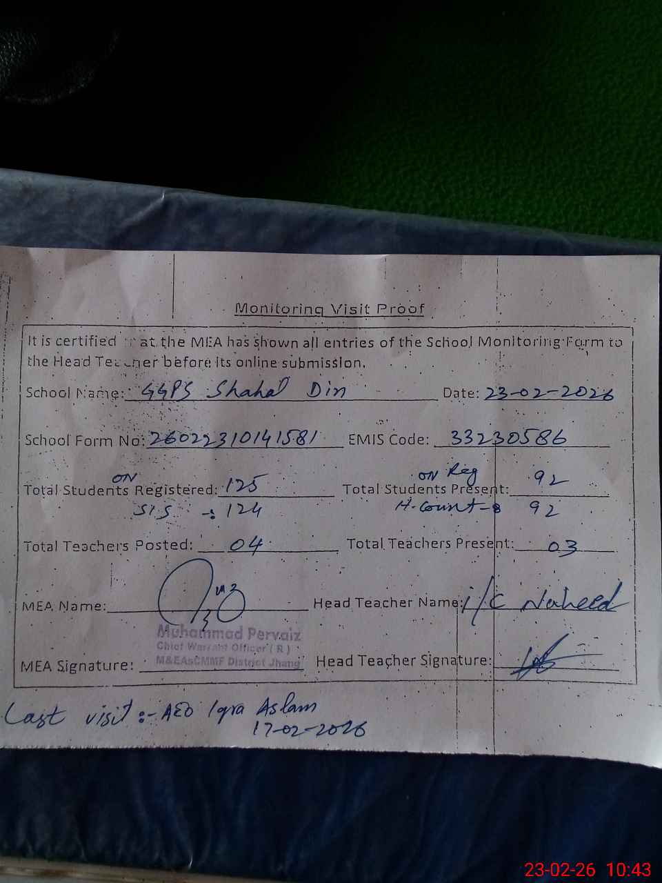 | Attendance Register | Head Teacher | MEA with School | Visit Proof |