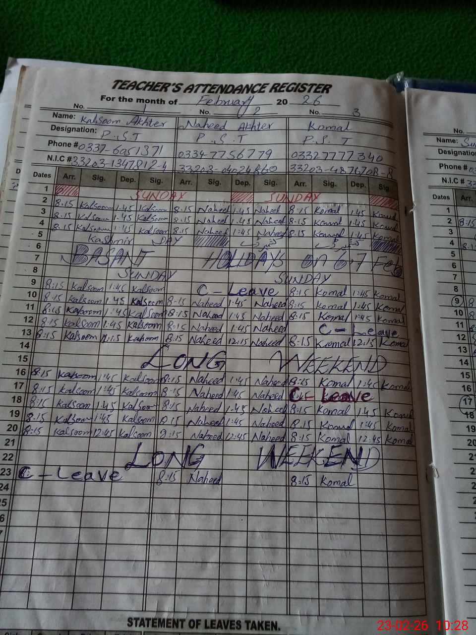 | CNIC | Full Name | Designation | R/C | Absence During Last Calender Month |