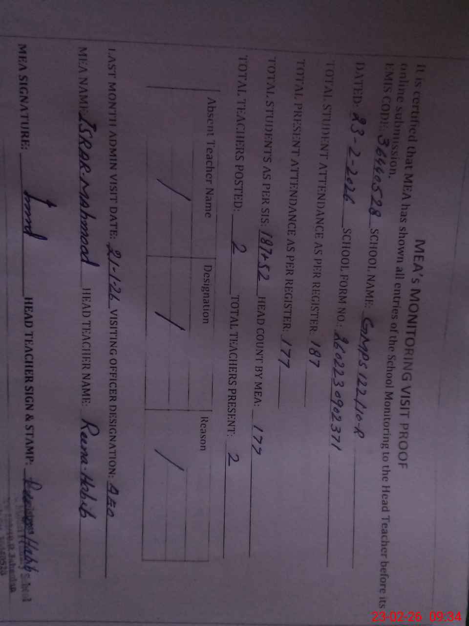 | Attendance Register | Head Teacher | MEA with School | Visit Proof |